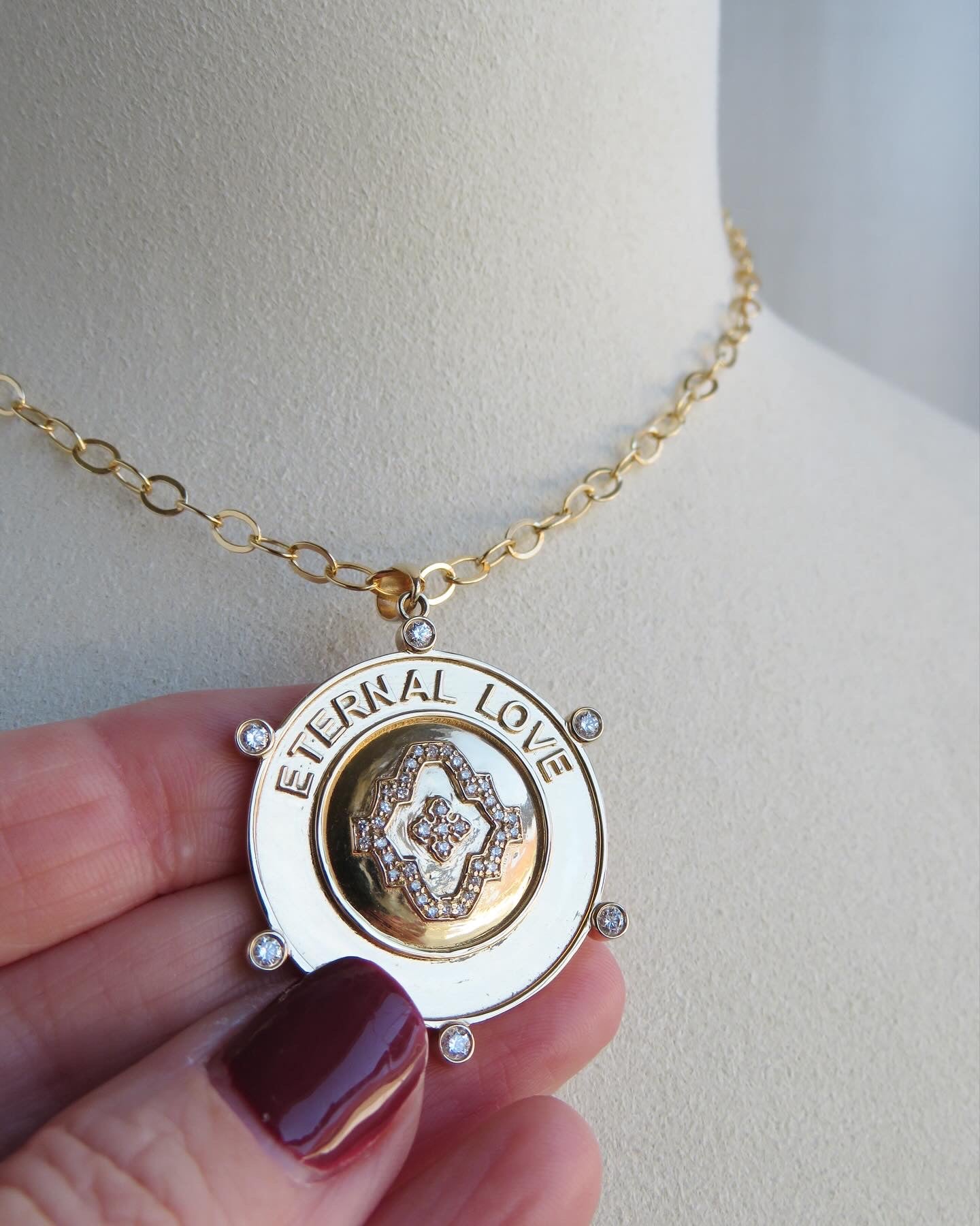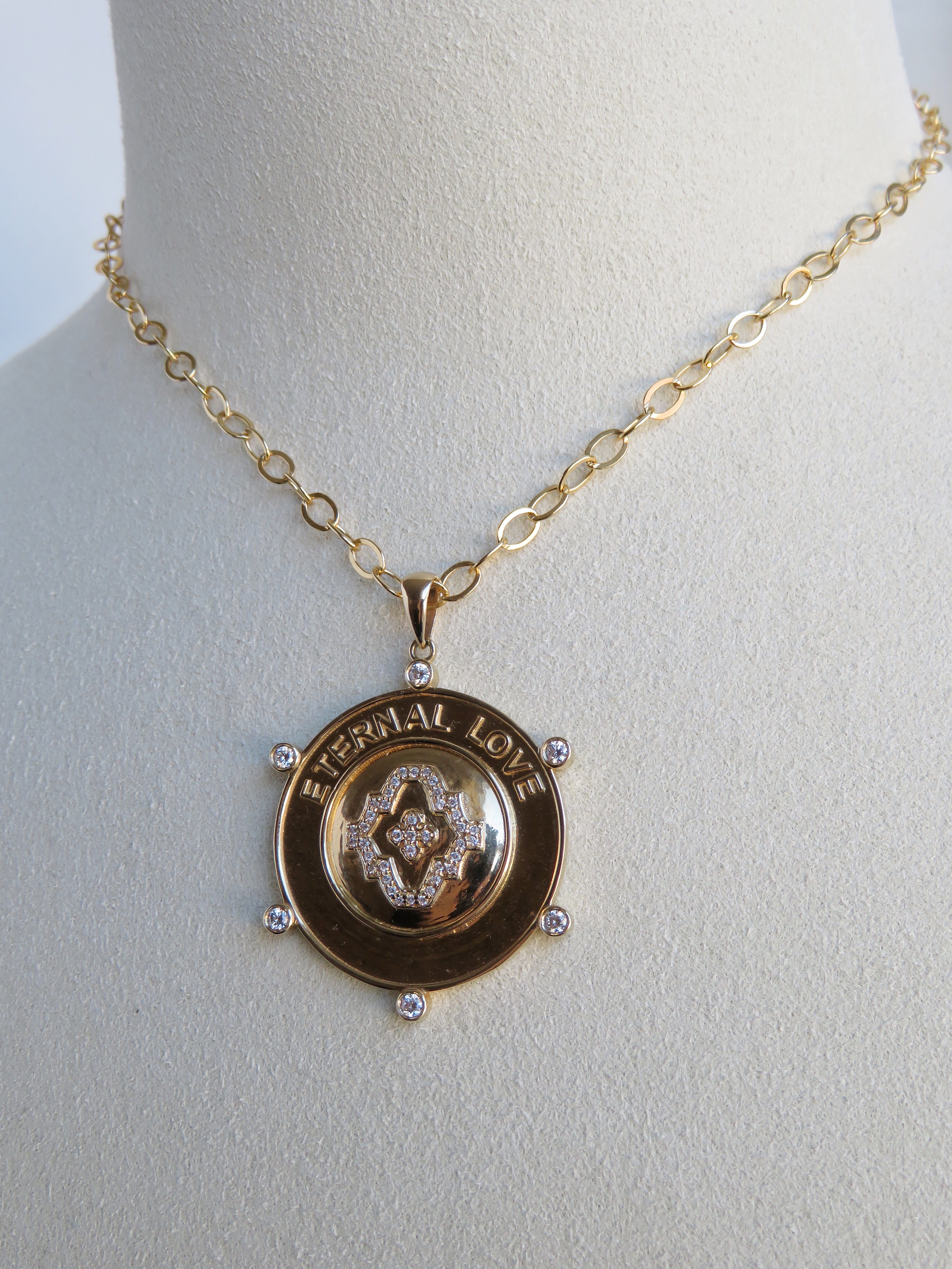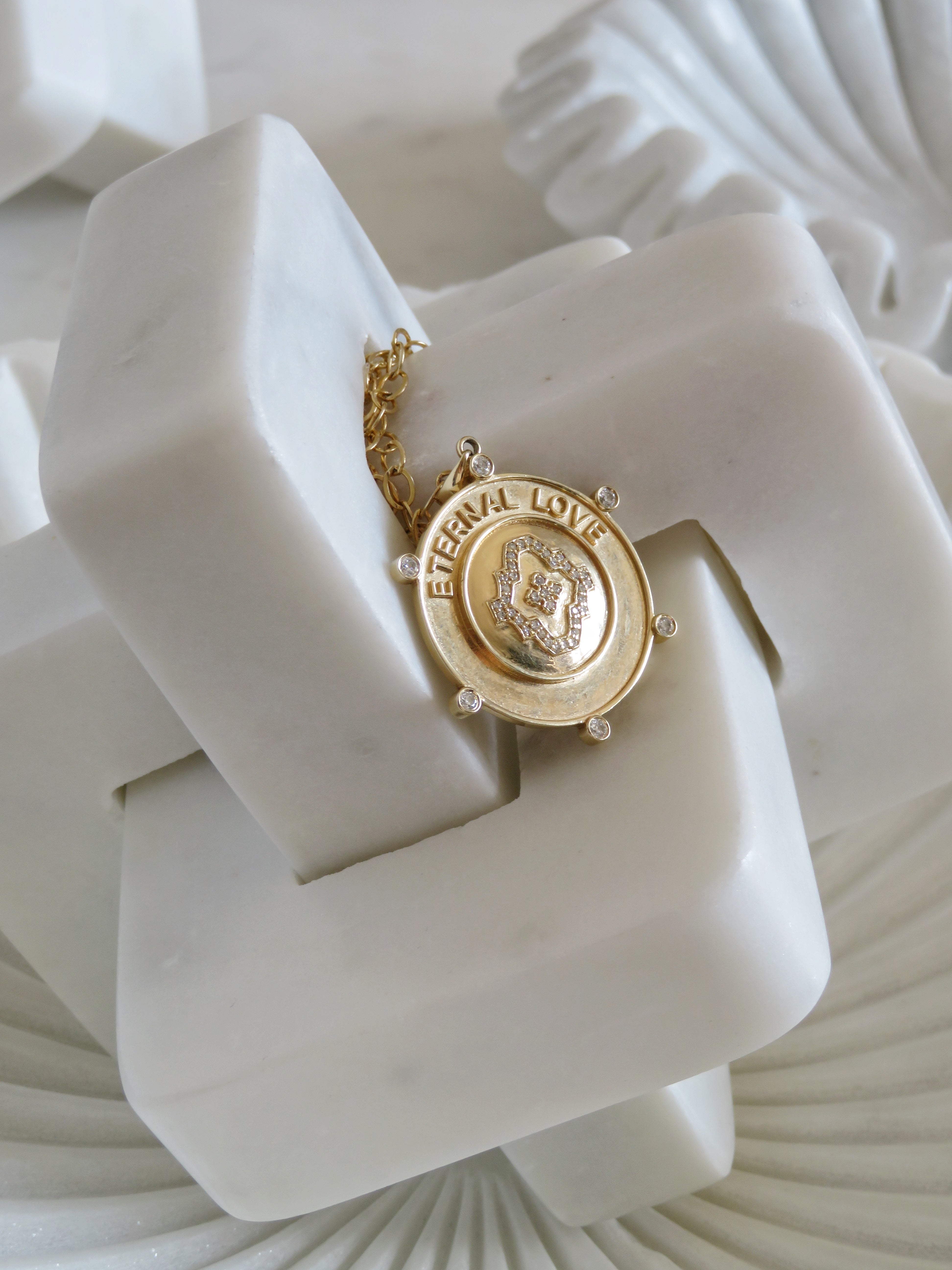 Handcrafted in 14k ElectroPlated Gold, this Eternal Love Medallion symbolizes the eternal bond between souls. The medallion represents the many layers of love and the bond we hold eternally with one another. There are 7 types of love Eros: Romantic, Philia: Friendship, Philautia: Self Love, Agape: Universal, Storge: Family, Ludus: Playful and Pragma: Longstanding
