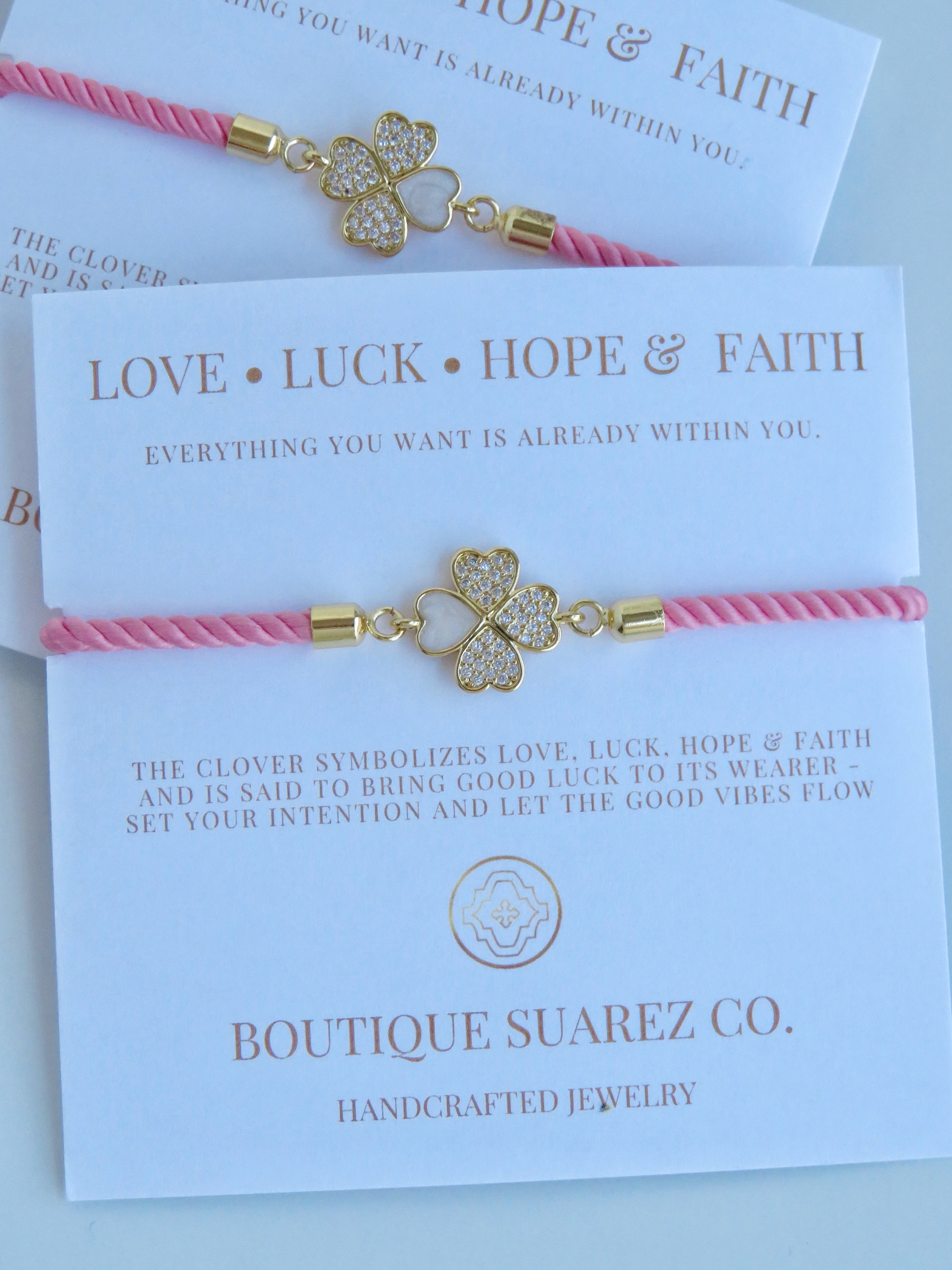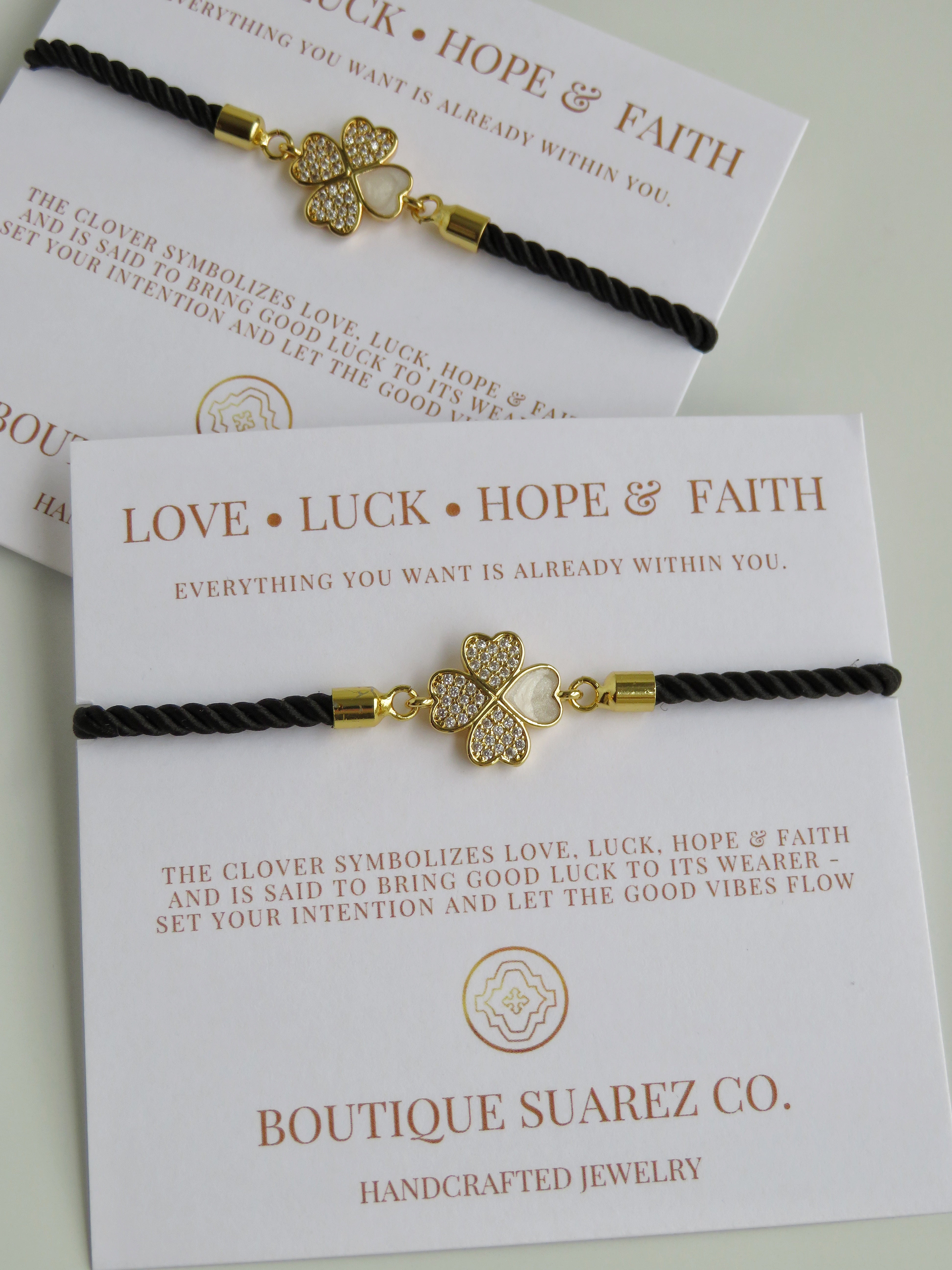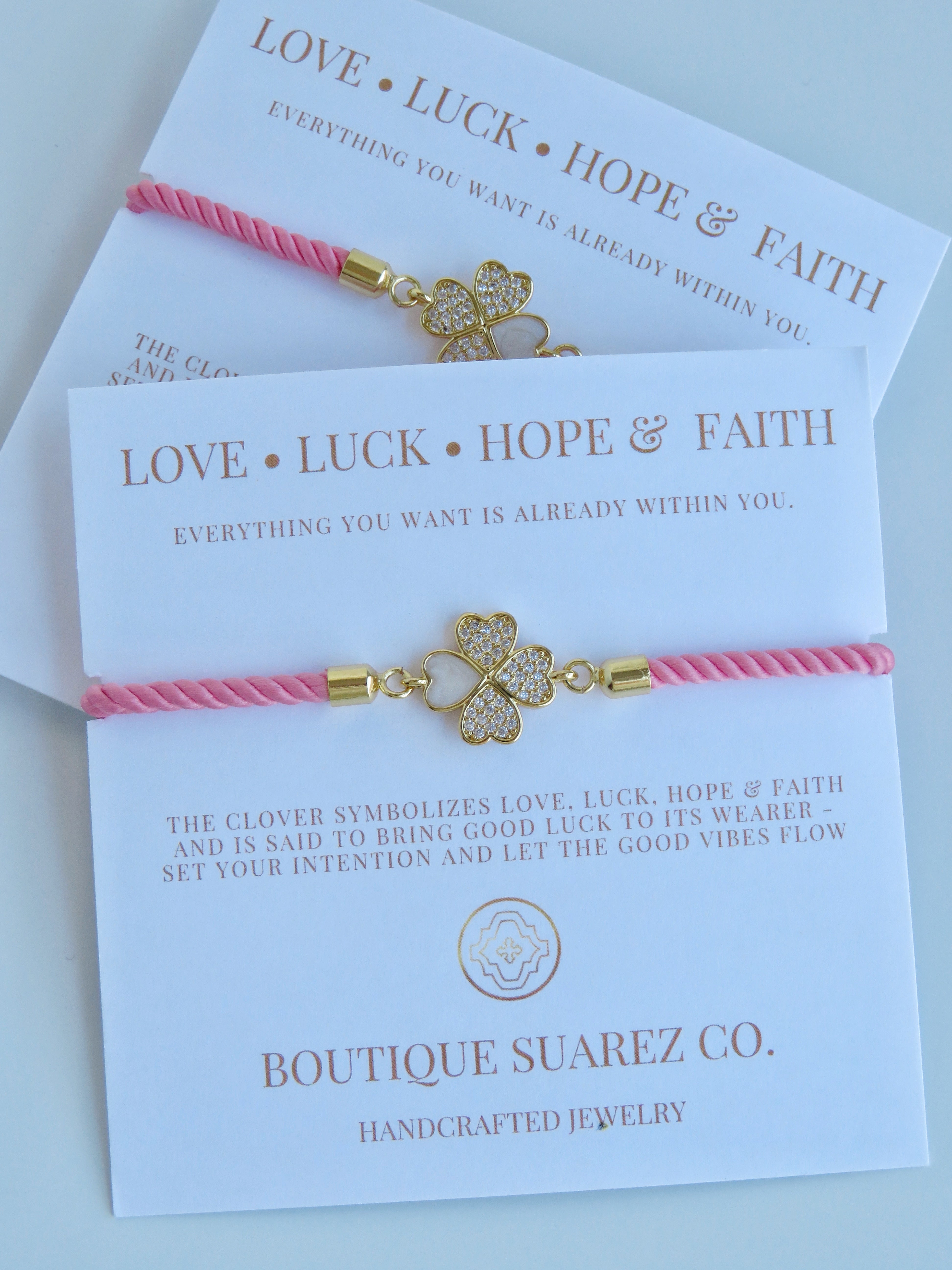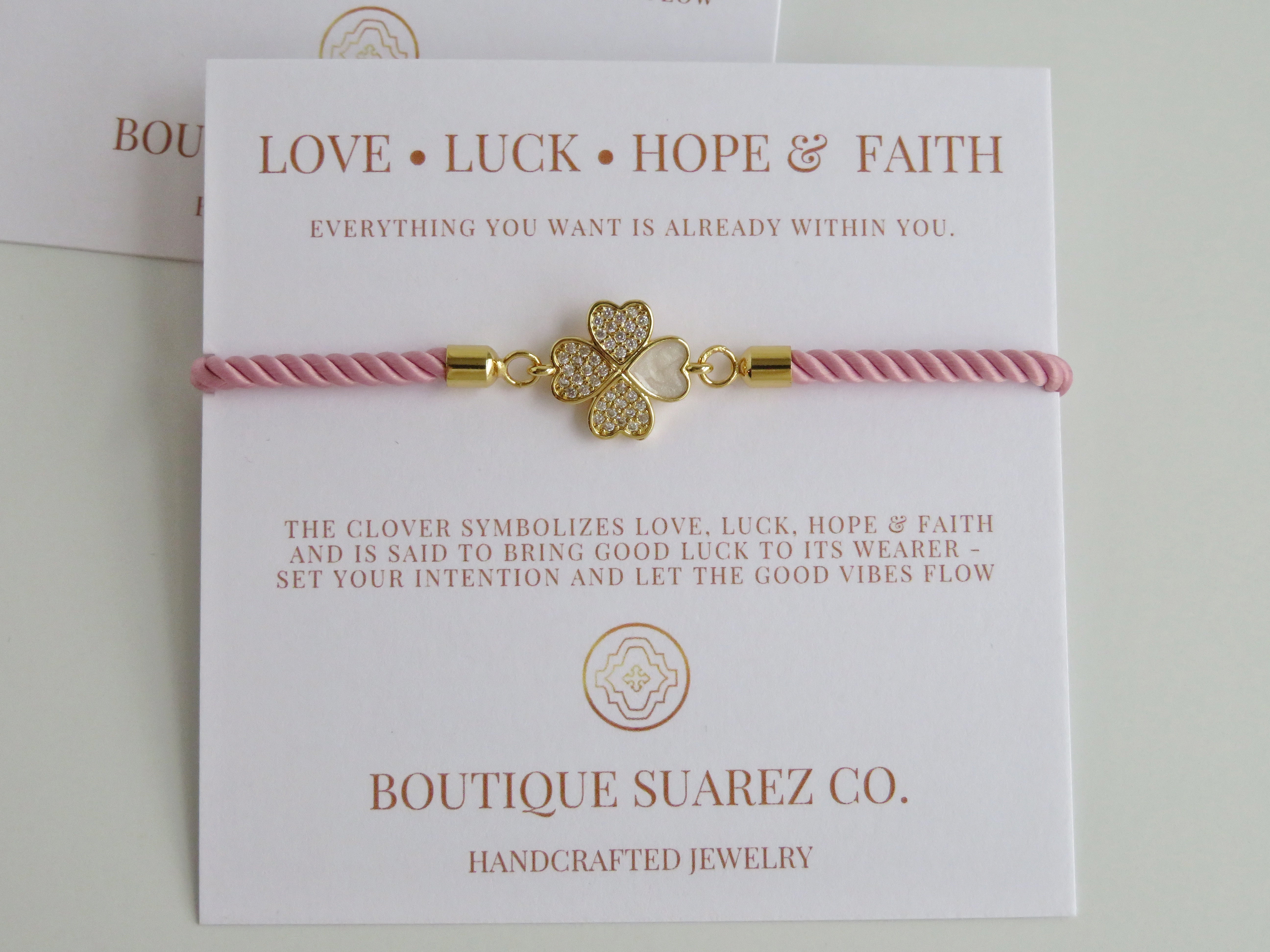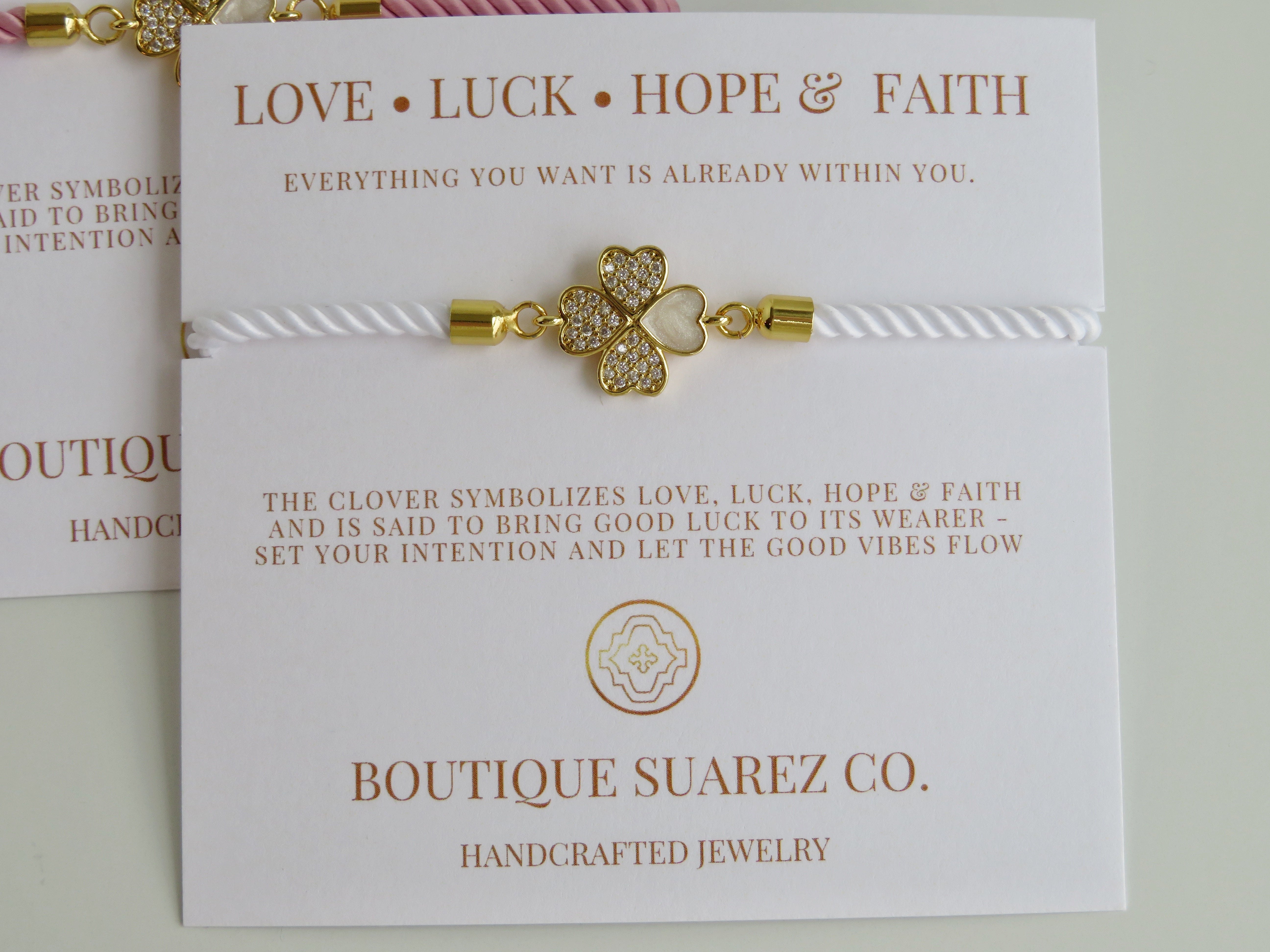 Silk cord with a diamond heart clover on our meaningful symbolic card. The clover symbolizes Love, Luck, Hope & Faith