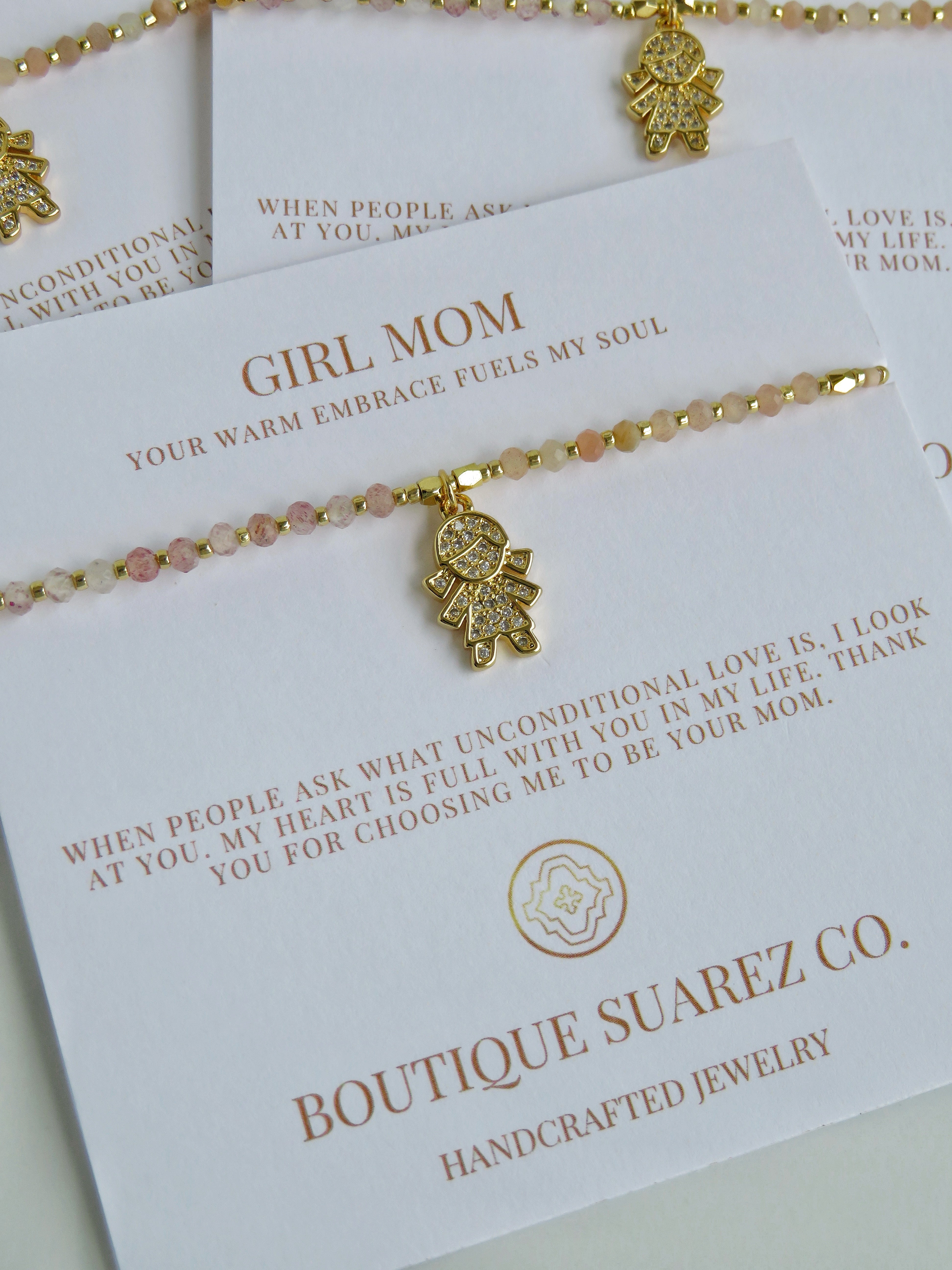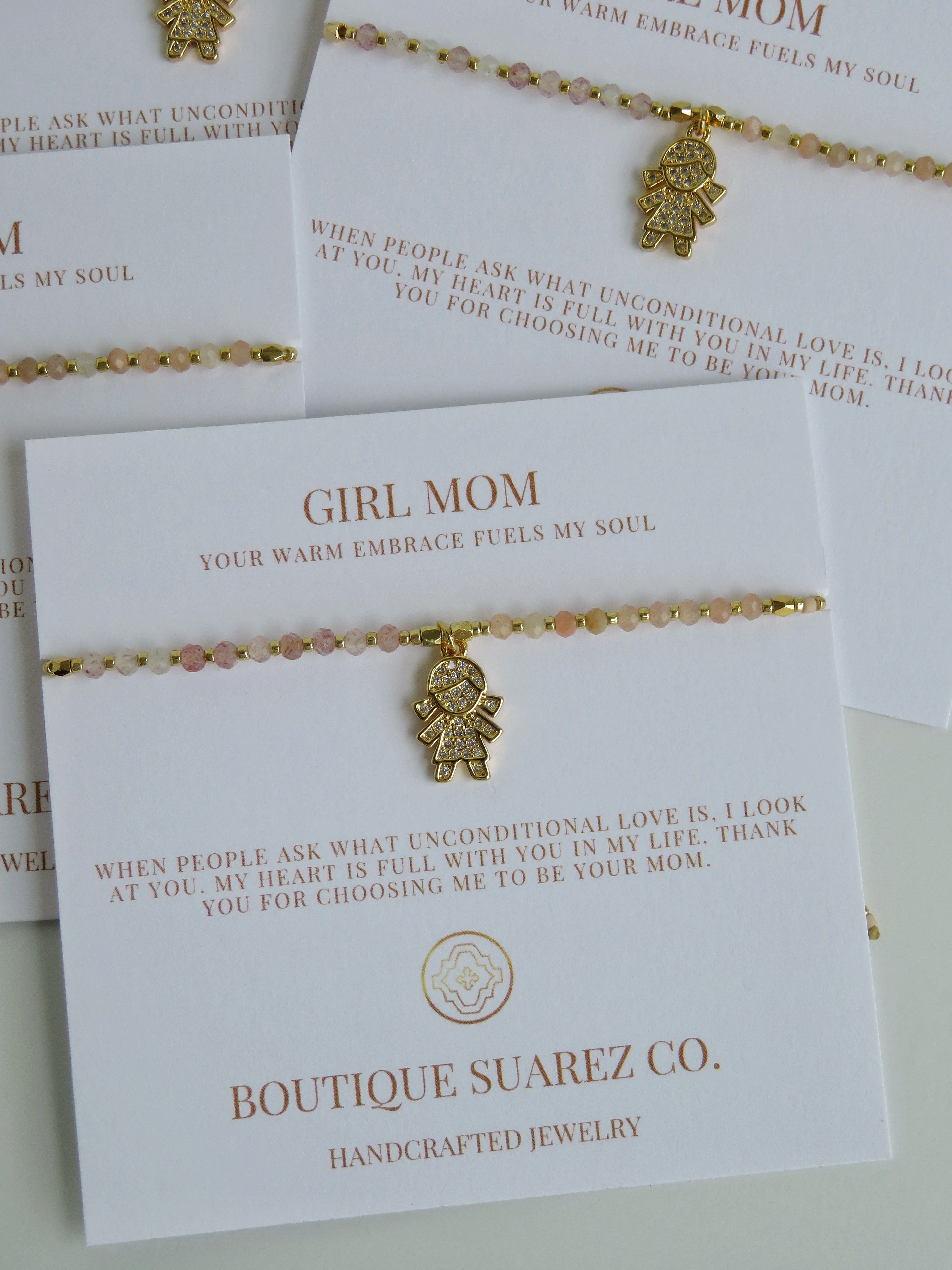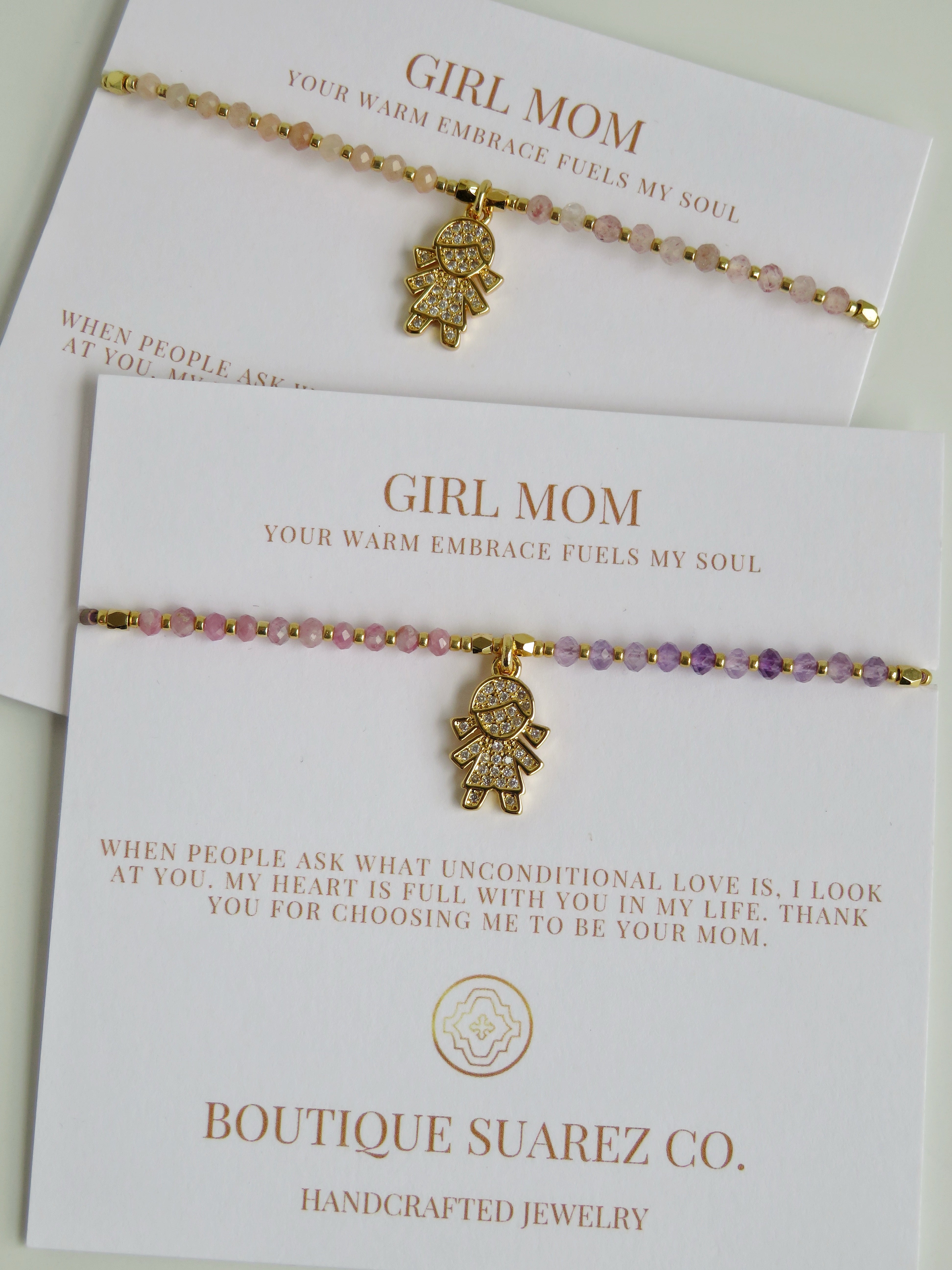 - Adjustable rose quartz (blush pink) or amethyst (lavender) beaded bracelet with a Diamond girl charm