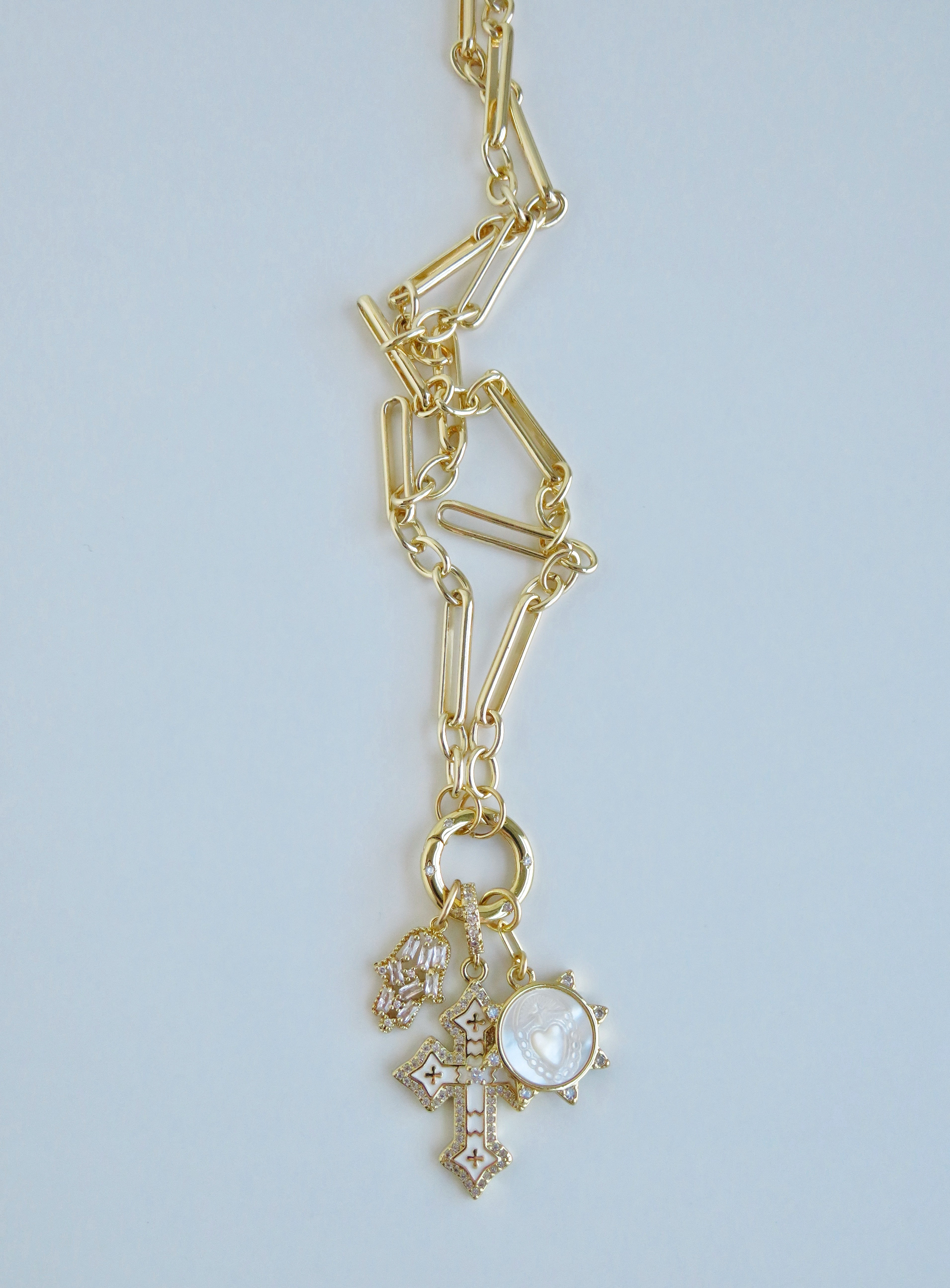 Whether you're looking to elevate your everyday style, deepen your spiritual practice, or find a meaningful gift for a loved one, this charm cluster is a beautiful choice. Wear it as a constant reminder to stay grounded in your authentic self and open to the blessings of the universe. Let its energy infuse your life with a sense of security, purpose, and divine support.