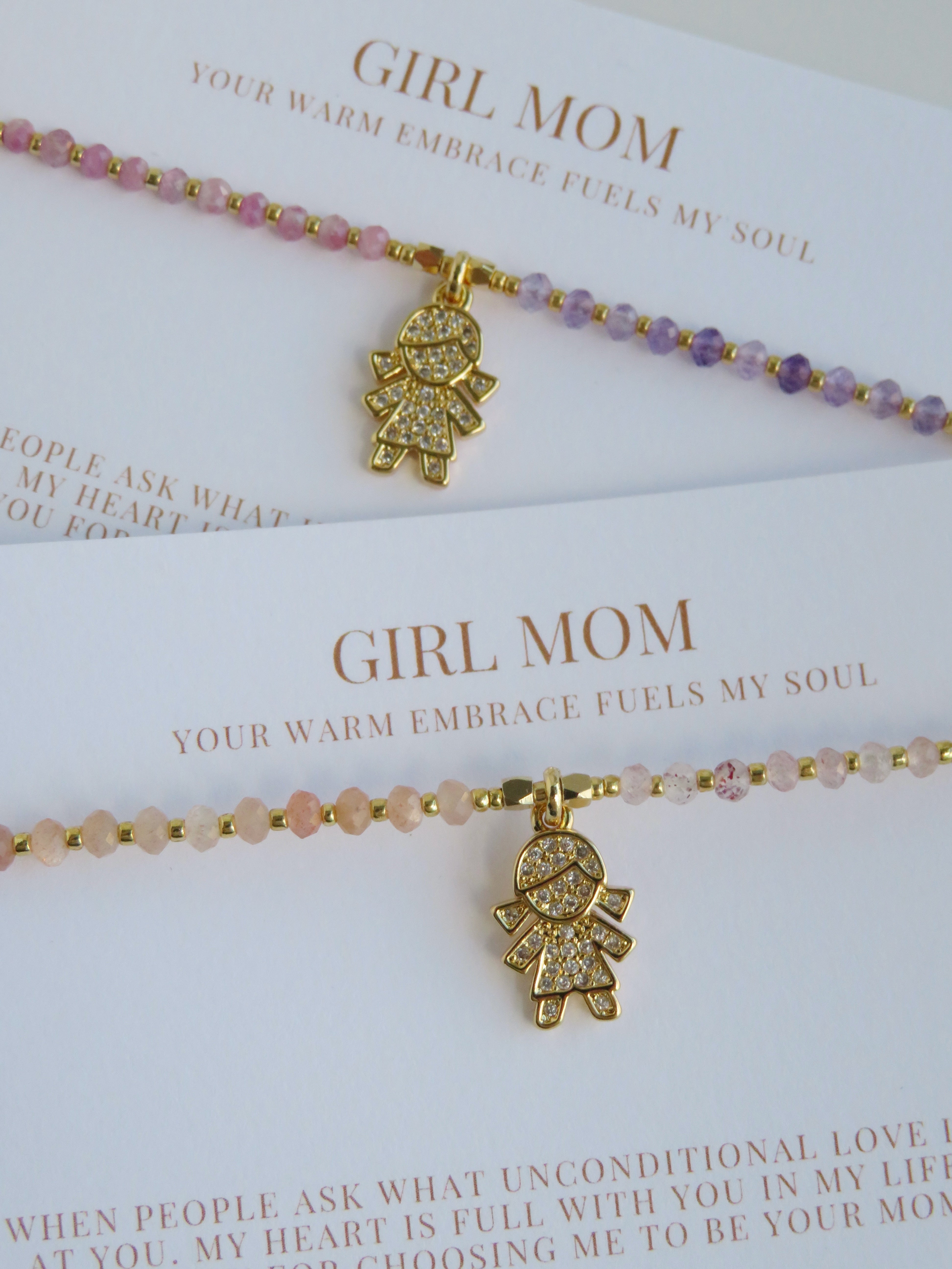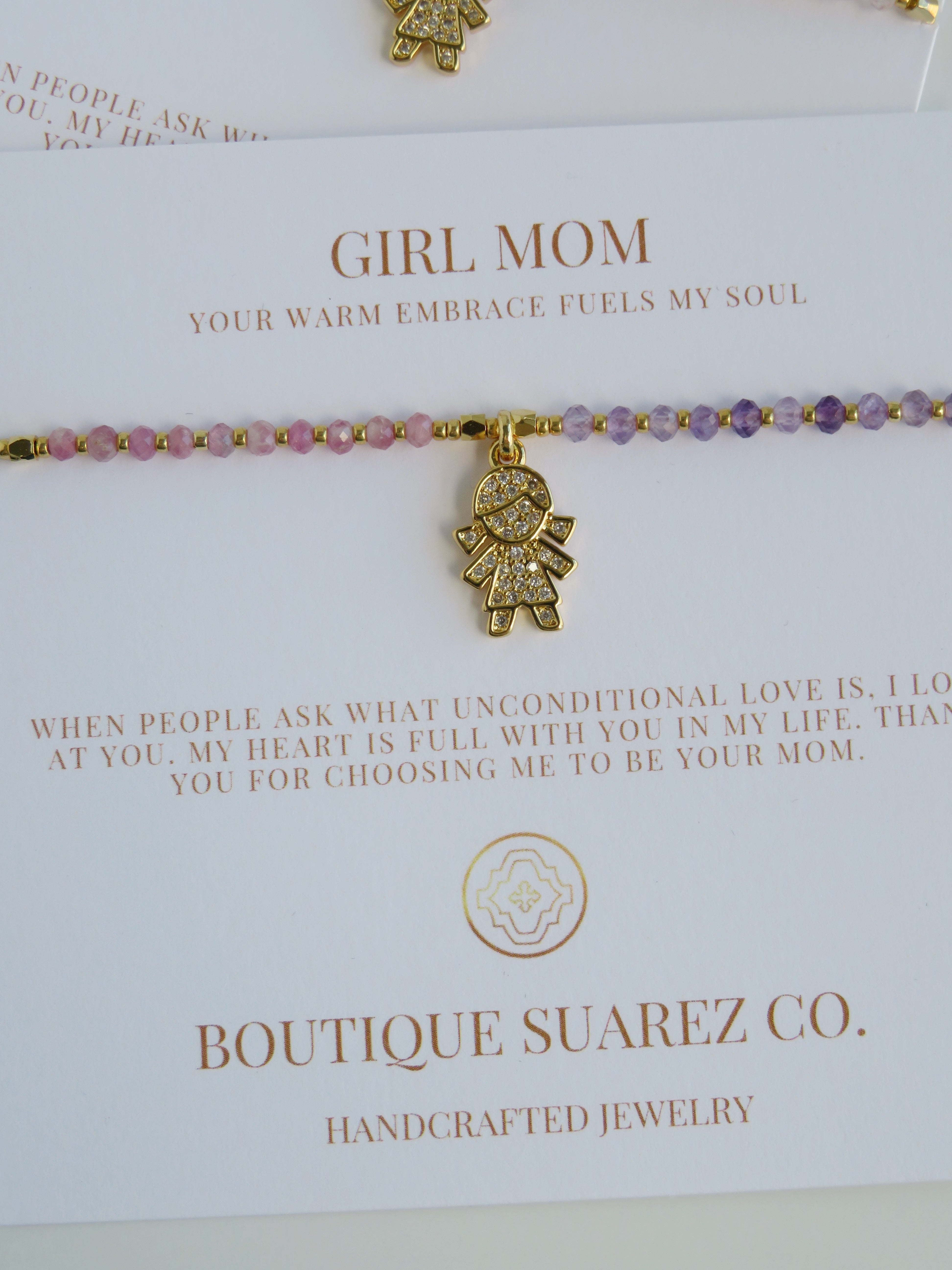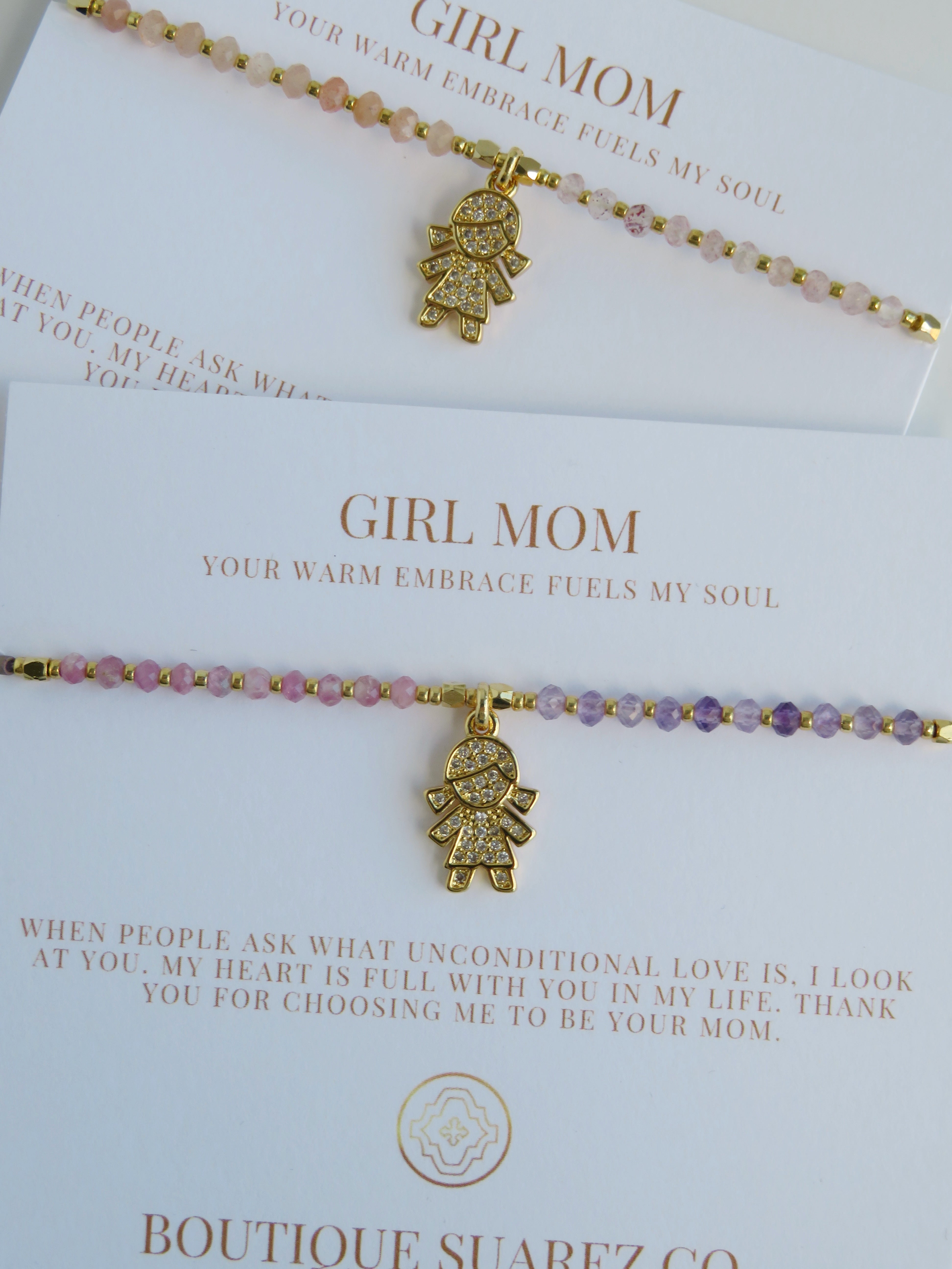 • Adjustable rose quartz (blush pink) or amethyst (lavender) beaded bracelet with a Diamond girl charm